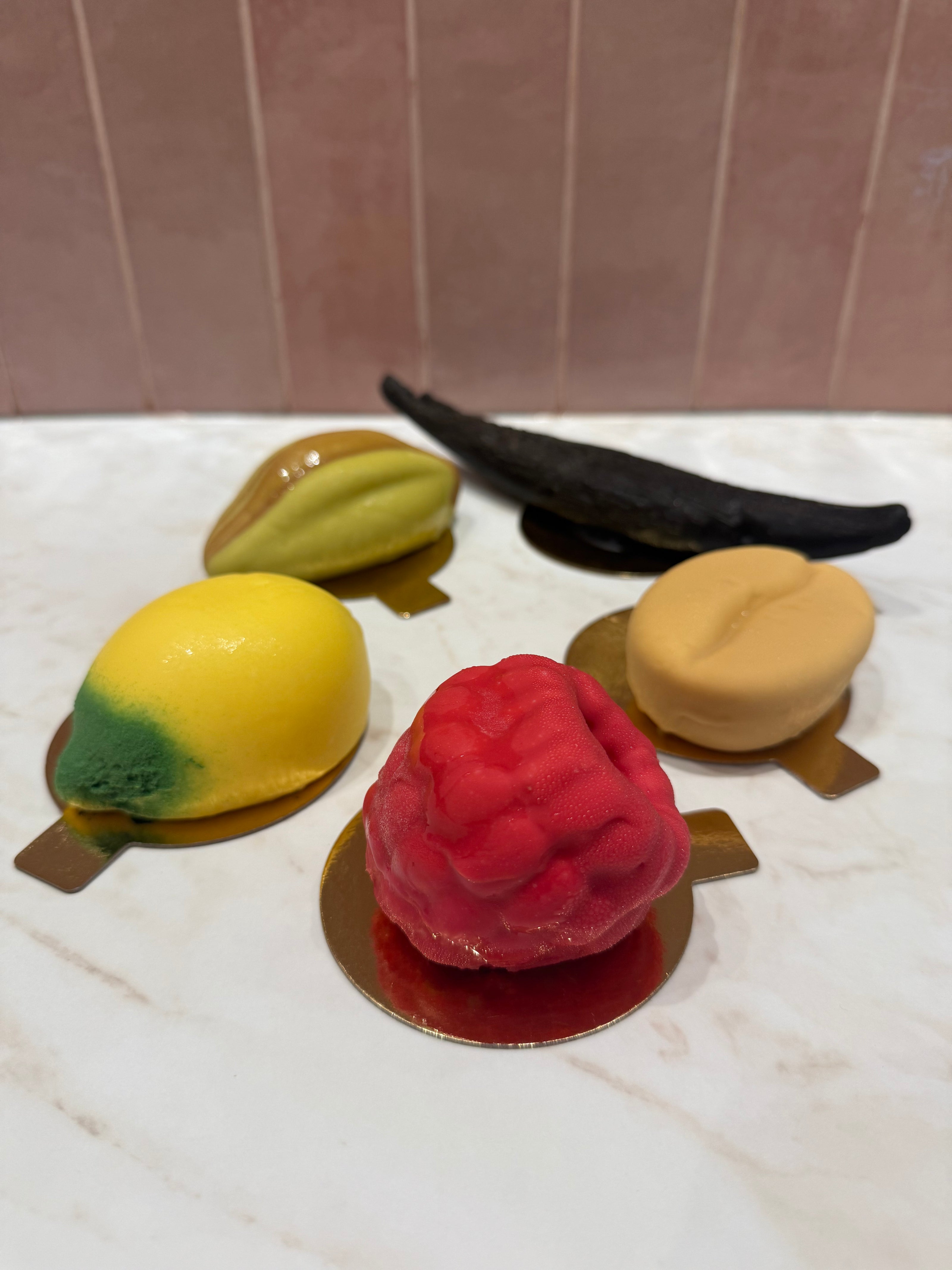 Framboise, cacahuète, citron, pistache, vanille, cacahuète, sapin de Noël, Teddy l'ourson, banane… Des fruits ultra réalistes qui cachent en réalité des créations pâtissières raffinées et savoureuses. Un dessert qui étonne, régale… et se fait photographier sous tous les angles !